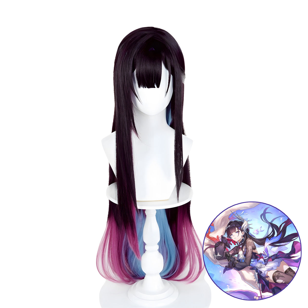 This wig uses a unique blend of red-brown, sky blue, and purple-red fibers, creating a vibrant and realistic multi-dimensional look that captures Hysilens’ distinct style while maintaining natural appeal in photography.